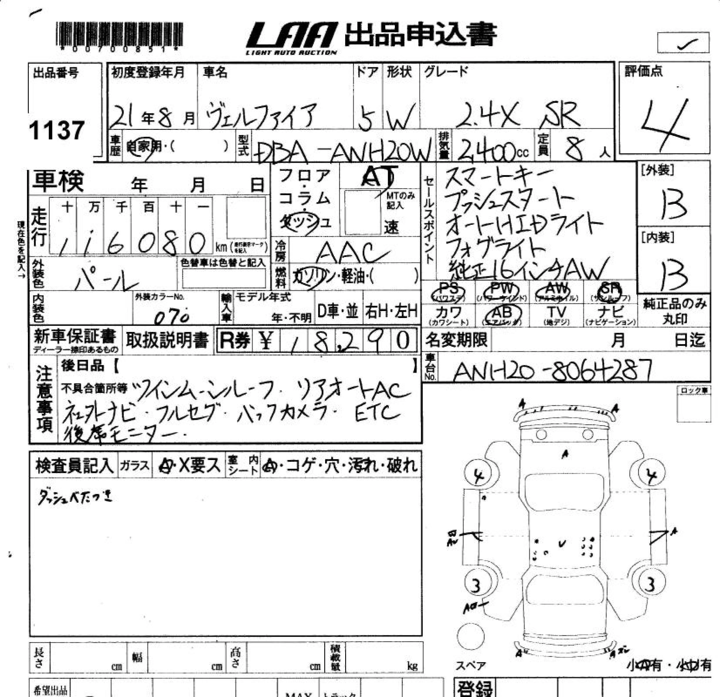TOYOTA VELLFIRE 2009 г., лот № 1137