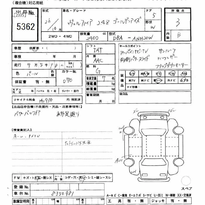TOYOTA VELLFIRE 2014 г., лот № 5362
