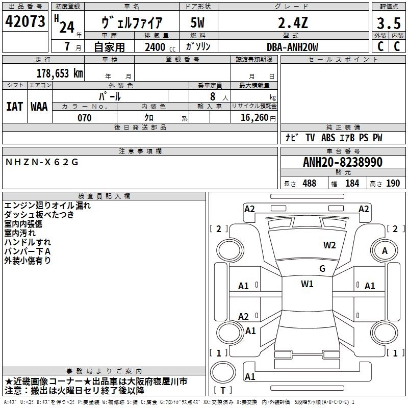 TOYOTA VELLFIRE 2012 г., лот № 42073