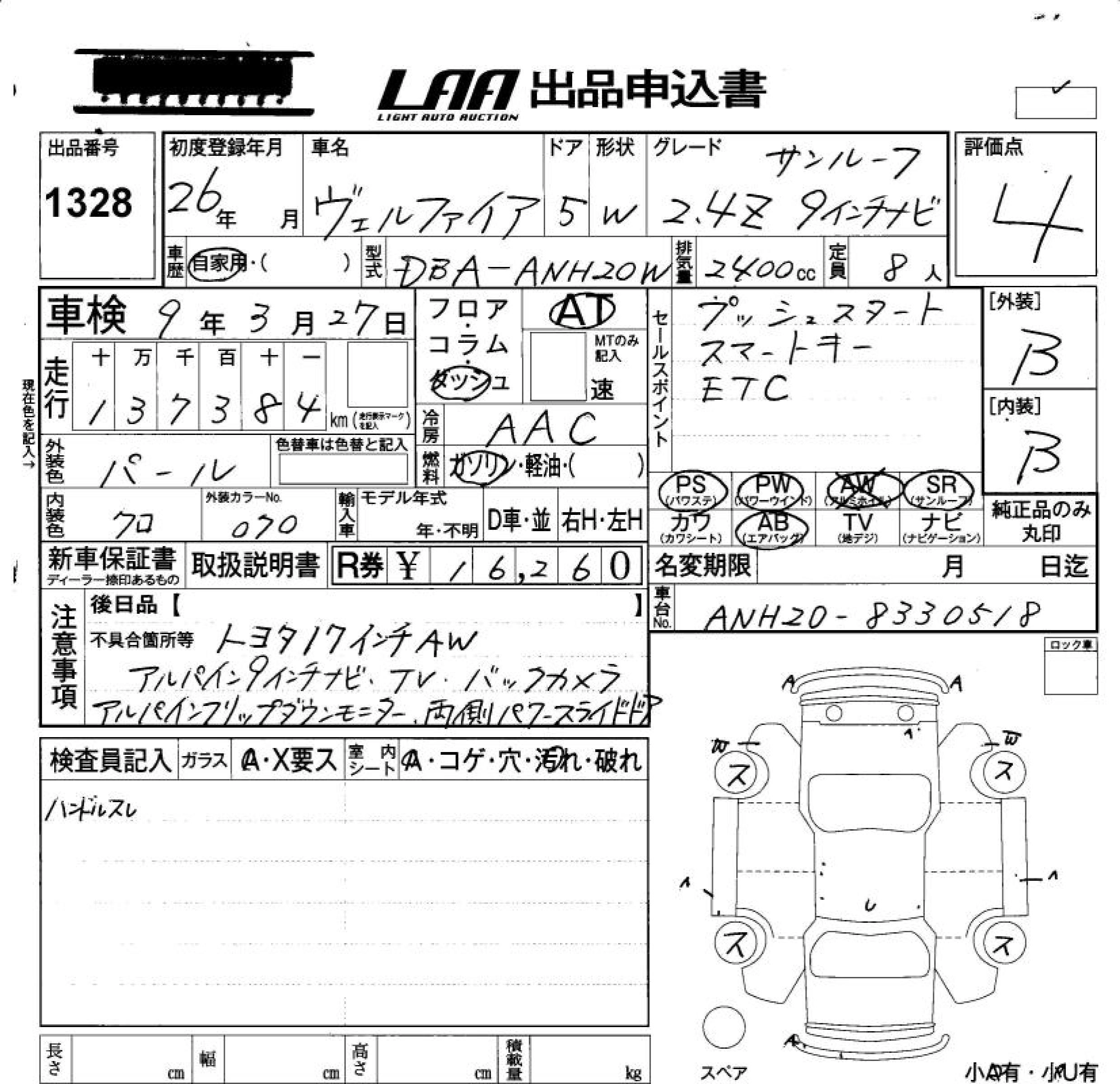 TOYOTA VELLFIRE 2014 г., лот № 1328