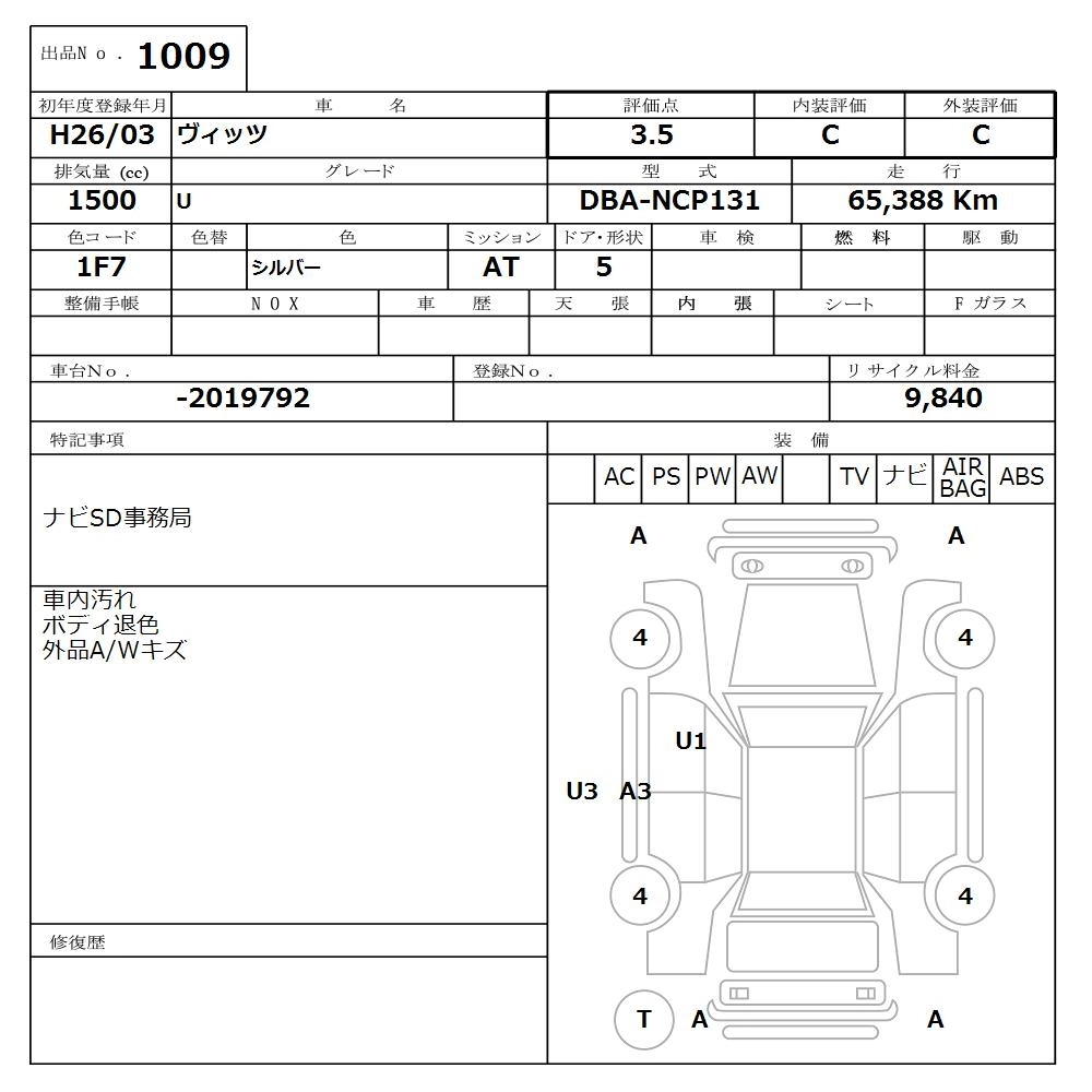 TOYOTA VITZ 2014 г., лот № 1009