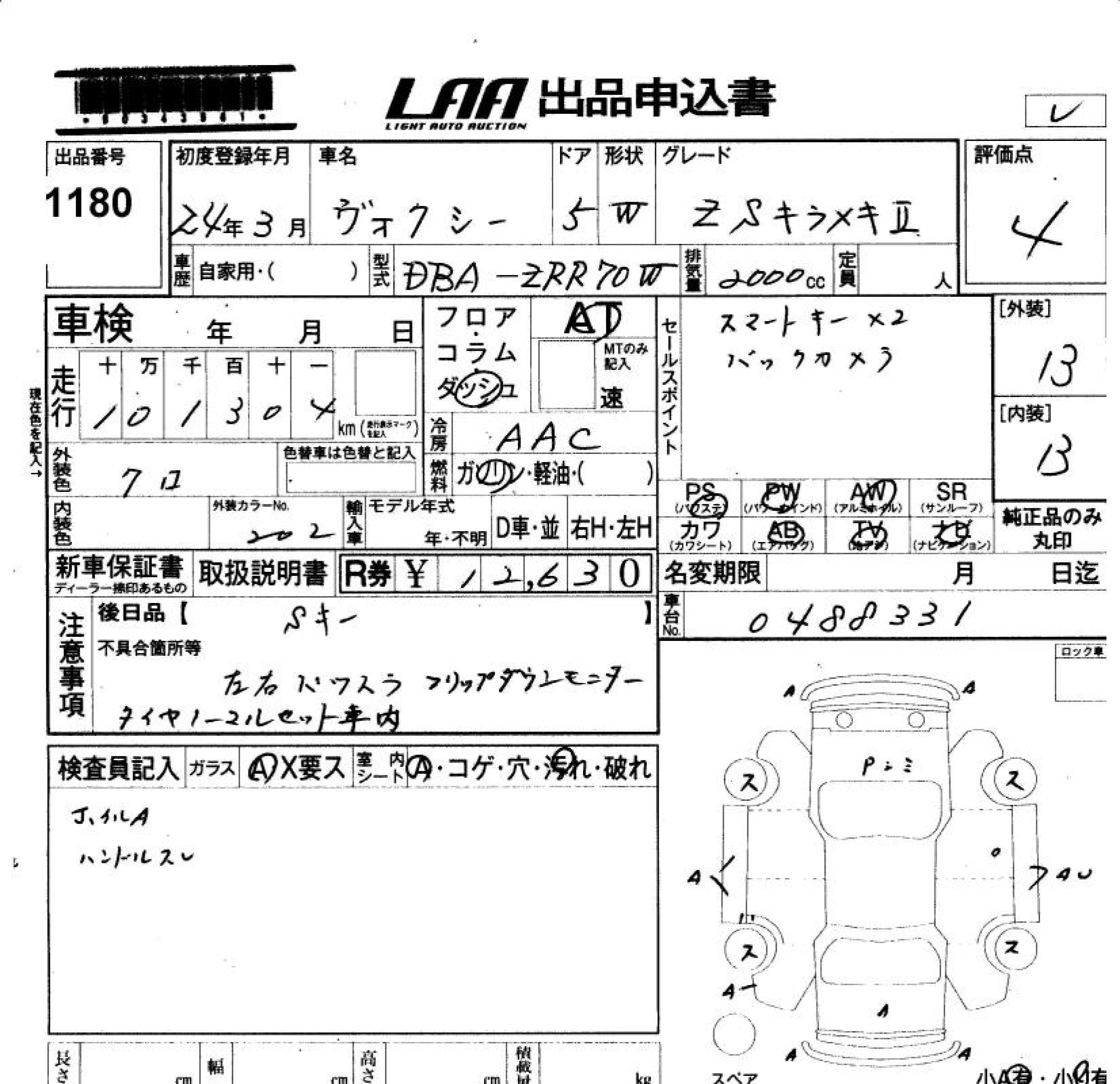 TOYOTA VOXY 2012 г., лот № 1180