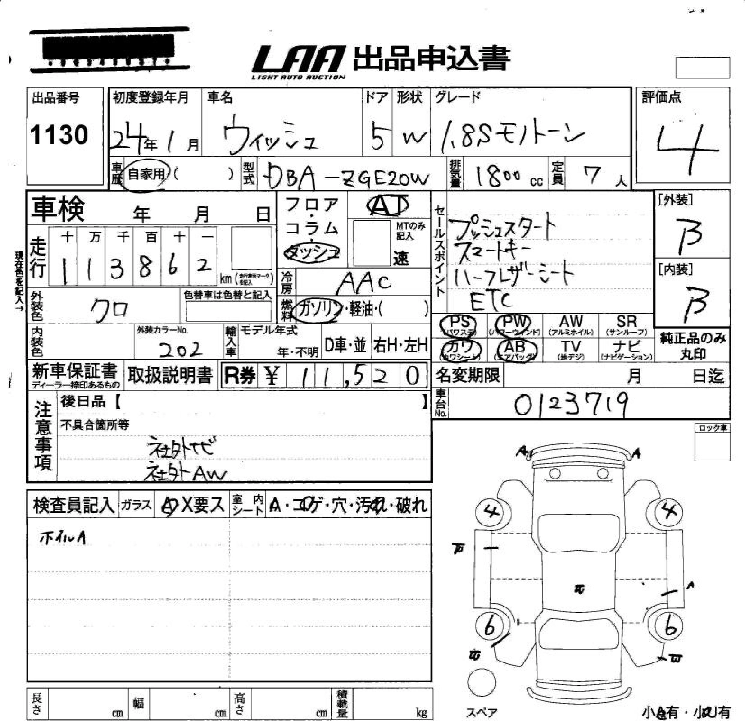 TOYOTA WISH 2012 г., лот № 1130