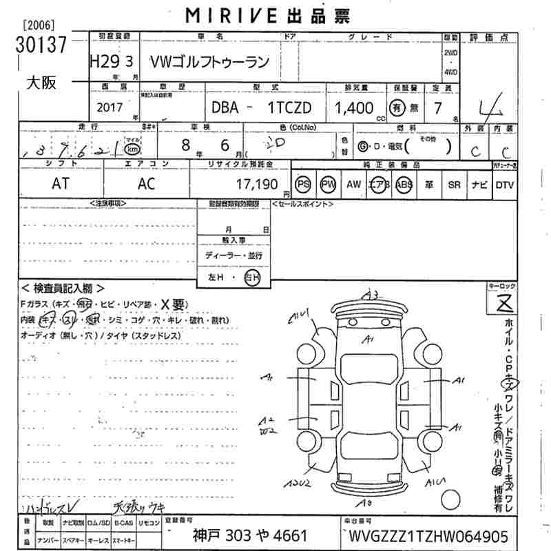 VOLKSWAGEN GOLF TOURAN 2017 г., лот № 30137