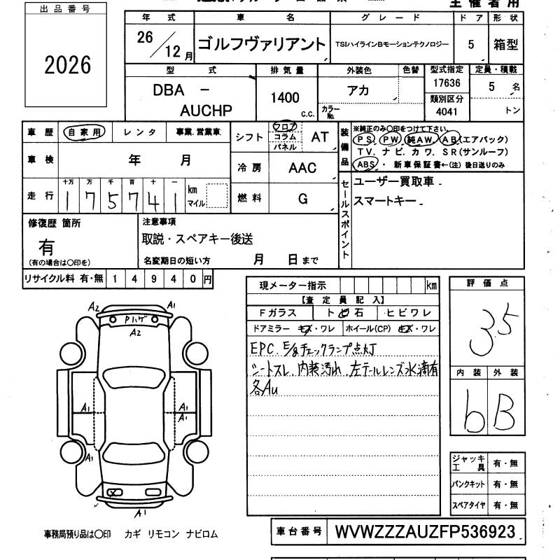 VOLKSWAGEN GOLF VARIANT 2014 г., лот № 2026