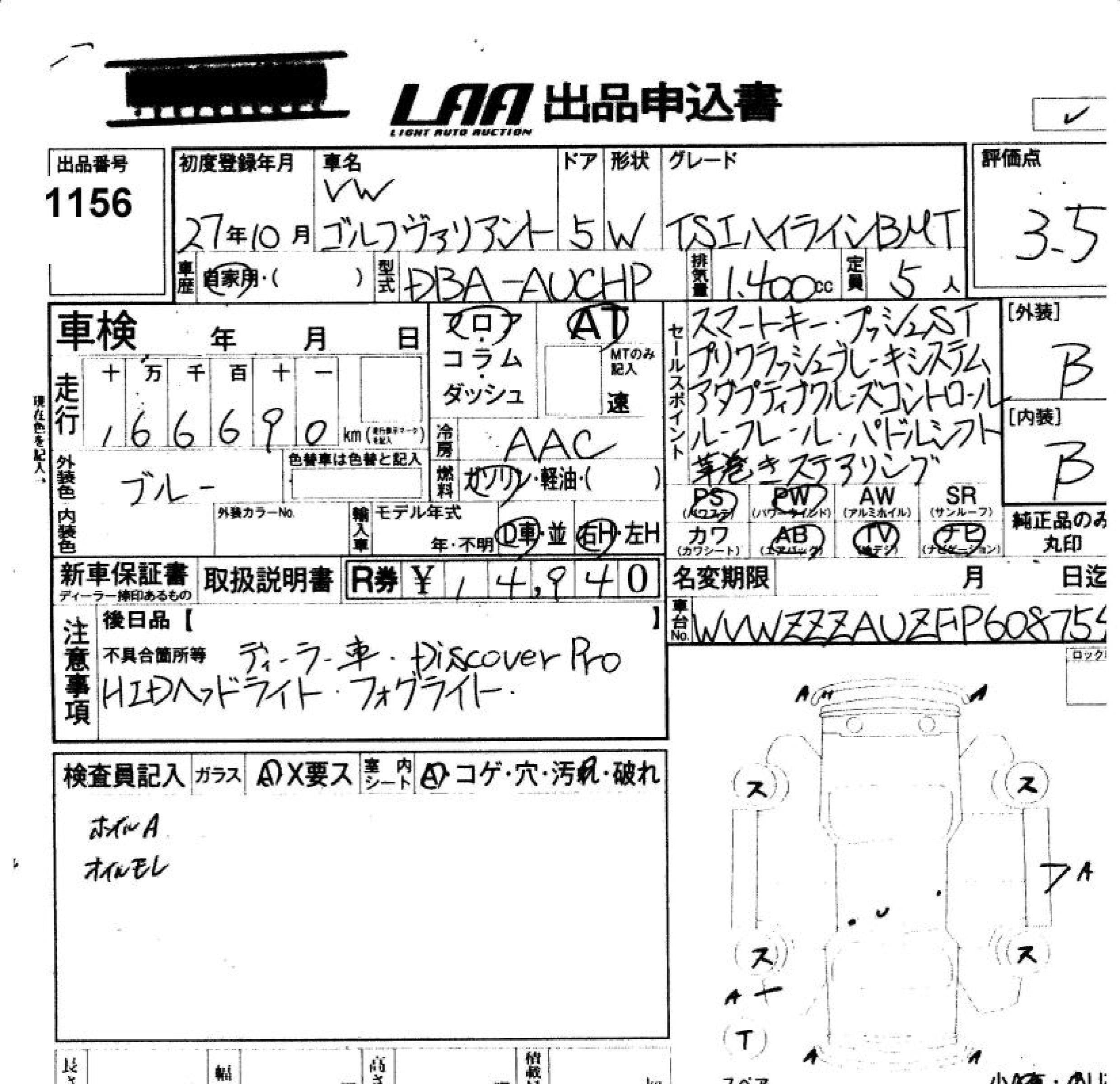 VOLKSWAGEN GOLF VARIANT 2015 г., лот № 1156