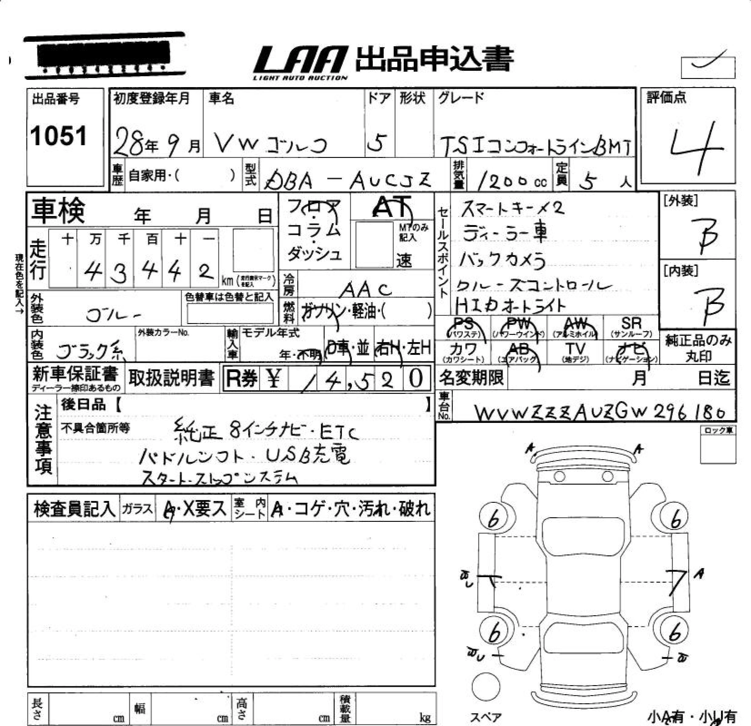 VOLKSWAGEN GOLF 2016 г., лот № 1051