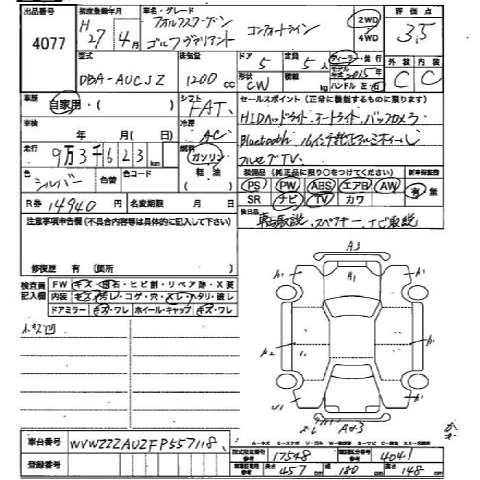 VOLKSWAGEN GOLF 2015 г., лот № 4077
