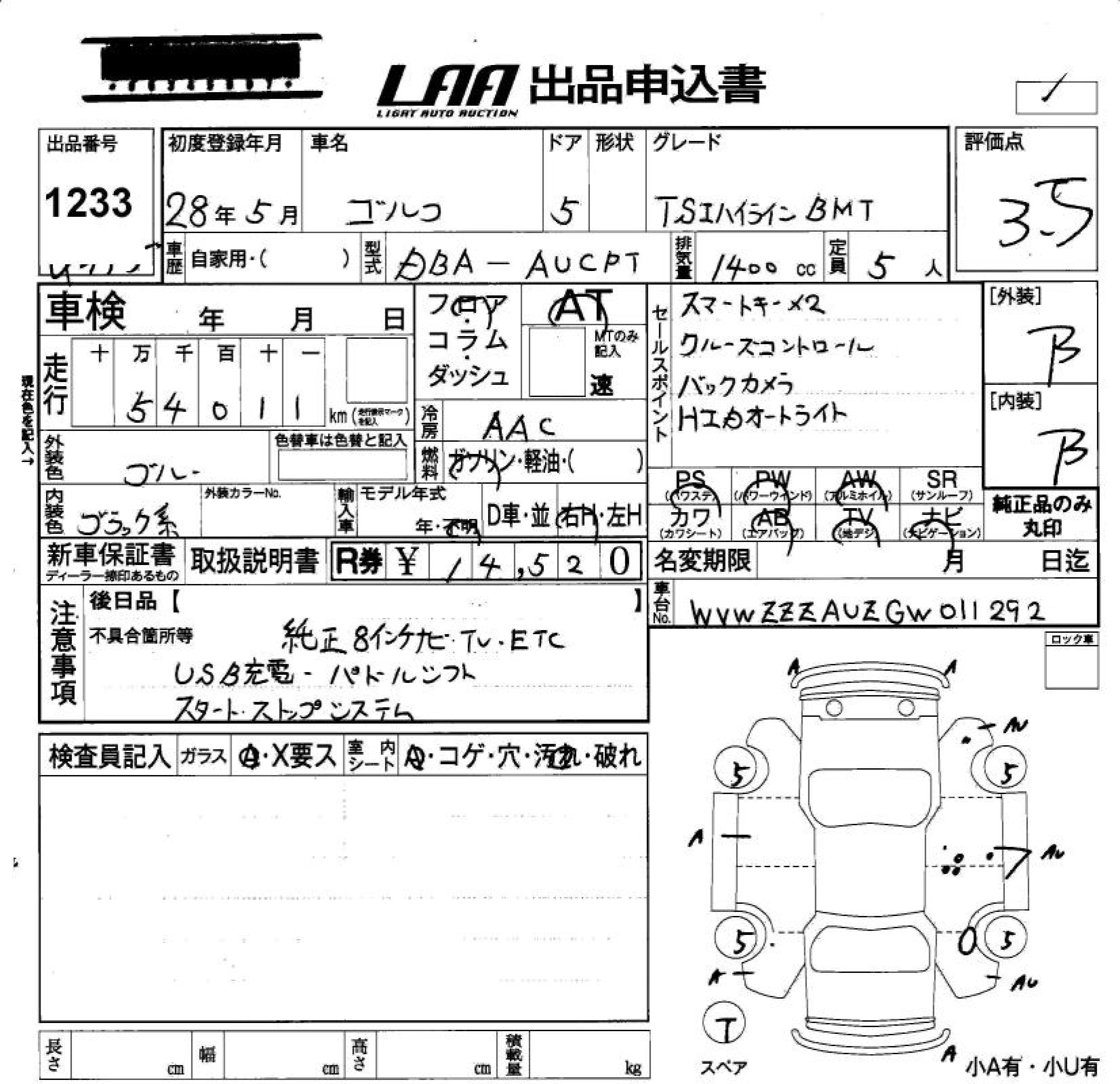 VOLKSWAGEN GOLF 2016 г., лот № 1233