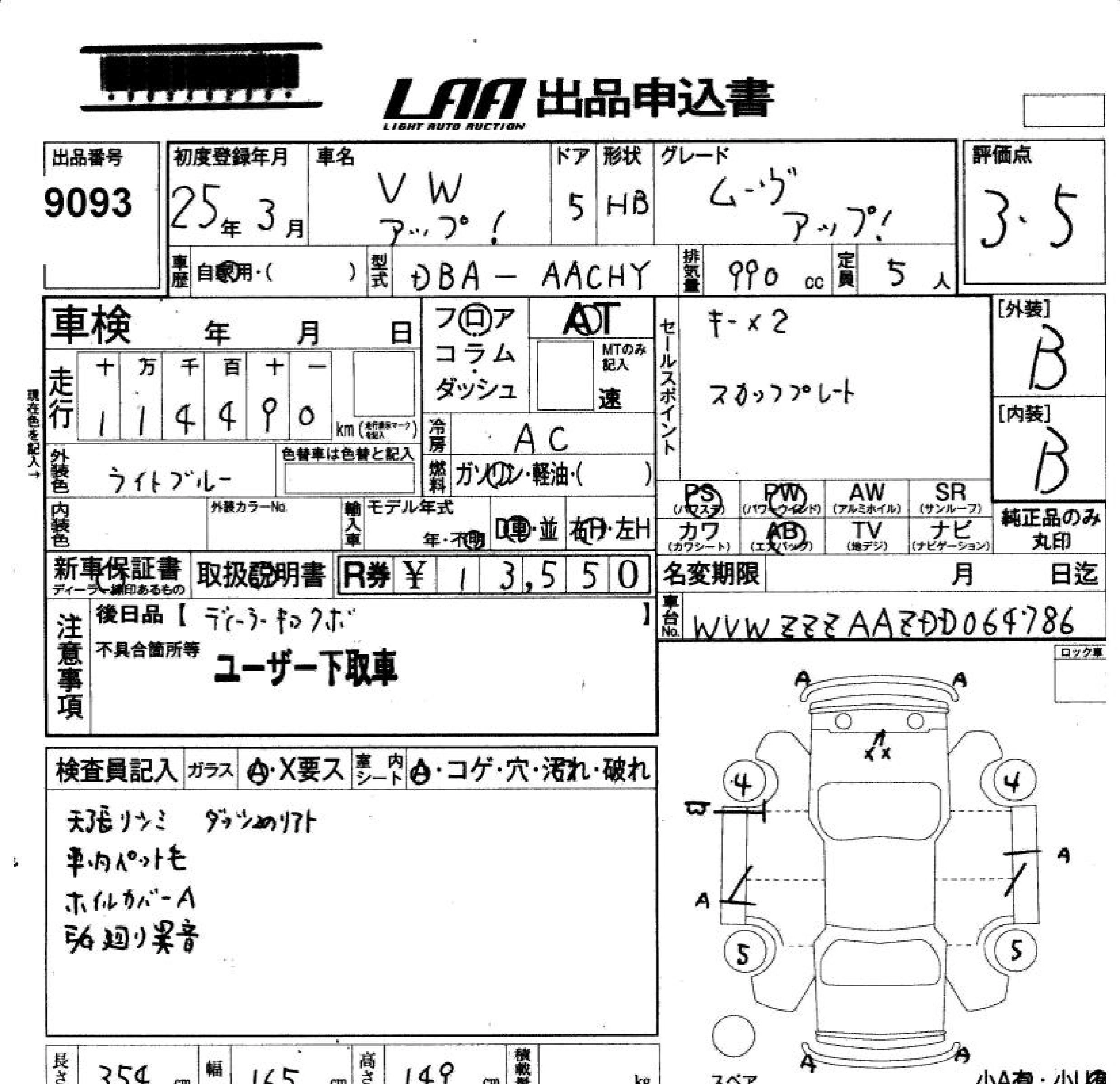 VOLKSWAGEN UP! 2013 г., лот № 9093