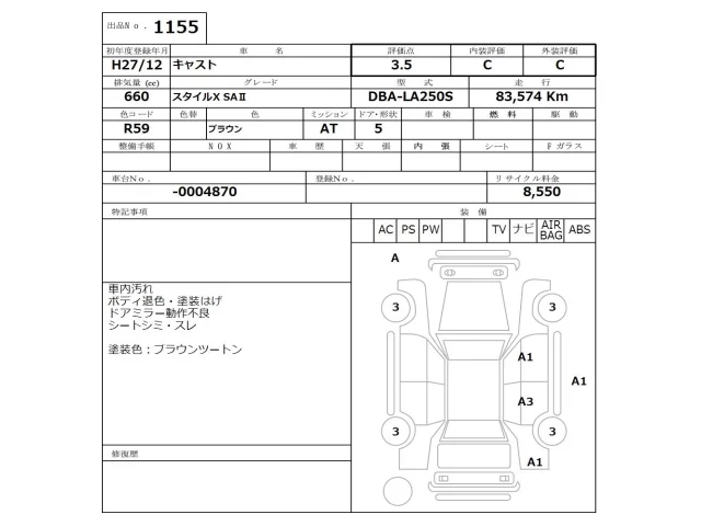 Аукцион NISSAN Osaka Дата аукциона 23.03.2026 Год2015 Тип кузоваХэтчбек Номер кузоваLA250S Объем660 сс Трансмиссия Автомат Привод Автомат Пробег 83 000 км Цветкоричневый Оценка3.5