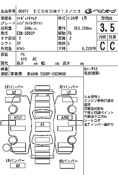 Аукцион BAYAUC Дата аукциона 08.04.2026 Год2016 Тип кузоваБортовой грузовик Номер кузоваS500P Объем660 сс Трансмиссия 5F Привод FR Пробег 554 000 км Цветбелый Оценка3.5