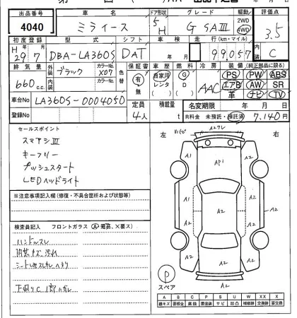 Аукцион SAA Sapporo Дата аукциона 24.02.2026 Год2017 Тип кузоваХэтчбек Номер кузоваLA360S Объем660 сс Трансмиссия Автомат Пробег 99 000 км Цветчерный Оценка3.5