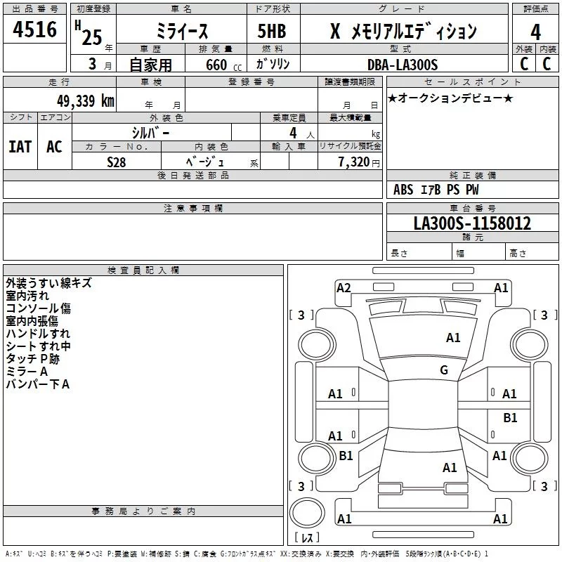Аукцион TAA Hiroshima Дата аукциона 07.04.2026 Год2013 Тип кузоваХэтчбек Номер кузоваLA300S Объем660 сс Трансмиссия IAT Пробег 49 000 км Цветсеребро Оценка4