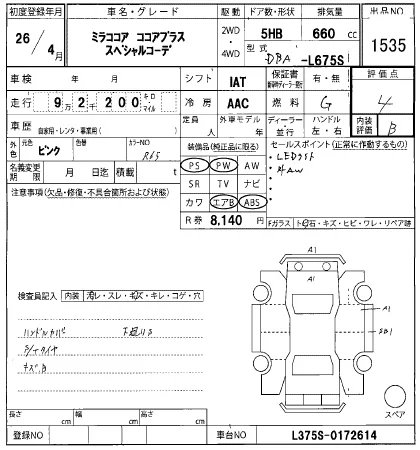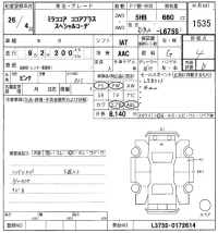 Аукцион HERO Дата аукциона 21.01.2026 Год2014 Номер кузоваL675S Объем660 сс Трансмиссия IA Привод Автомат Пробег 93 000 км Цветрозовый Оценка4