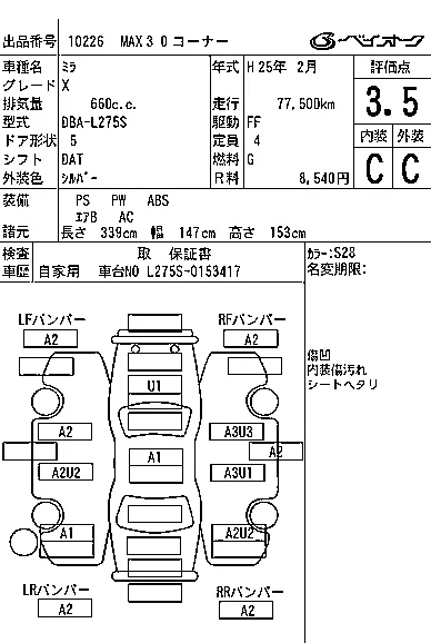 Аукцион BAYAUC Дата аукциона 18.02.2026 Год2013 Тип кузоваХэтчбек Номер кузоваL275S Объем660 сс Трансмиссия DAT Привод Автомат Пробег 78 000 км Цветсеребро Оценка3.5