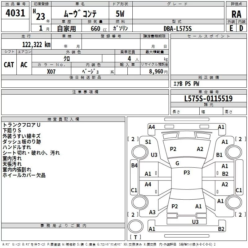 Аукцион TAA Hyogo Дата аукциона 27.12.2025 Год2011 Тип кузоваХэтчбек Номер кузоваL575S Объем660 сс Трансмиссия CAT Привод Автомат Пробег 122 000 км Цветчерный ОценкаRA