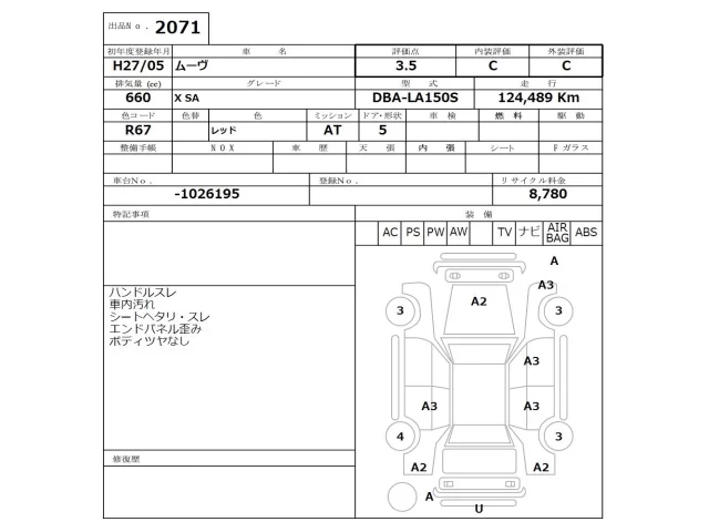 Аукцион NISSAN Osaka Дата аукциона 30.03.2026 Год2015 Тип кузоваХэтчбек Номер кузоваLA150S Объем660 сс Трансмиссия Автомат Привод Автомат Пробег 124 000 км Цветкрасный Оценка3.5