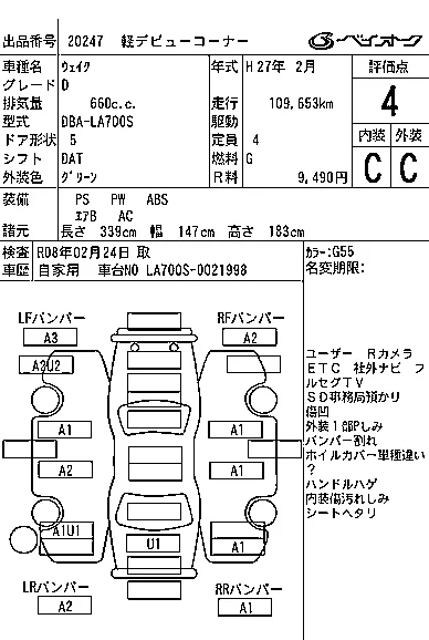 Аукцион BAYAUC Дата аукциона 26.11.2025 Год2015 Тип кузоваХэтчбек Номер кузоваLA700S Объем660 сс Трансмиссия DAT Привод Автомат Пробег 110 000 км Цветзеленый Оценка4