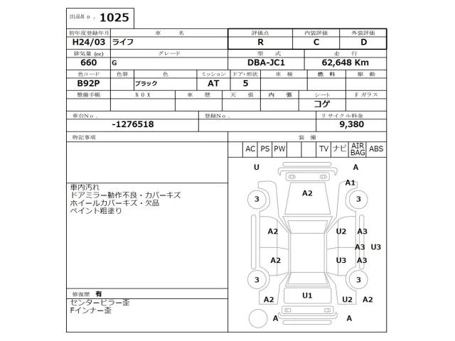 Аукцион NISSAN Osaka Дата аукциона 12.01.2026 Год2012 Тип кузоваХэтчбек Номер кузоваJC1 Объем660 сс Трансмиссия Автомат Привод Автомат Пробег 62 000 км Цветчерный ОценкаR
