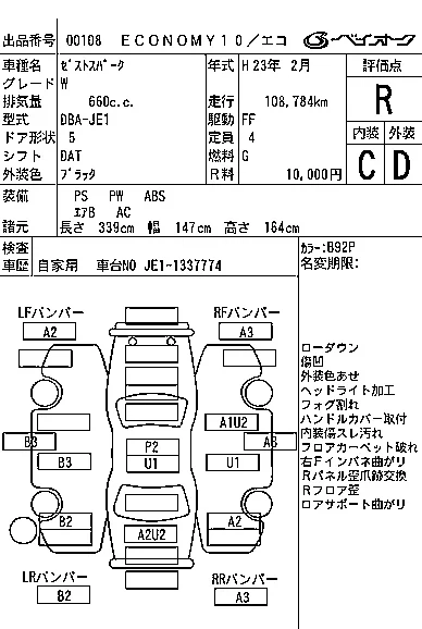 Аукцион BAYAUC Дата аукциона 25.02.2026 Год2011 Тип кузоваХэтчбек Номер кузоваJE1 Объем660 сс Трансмиссия DAT Привод Автомат Пробег 109 000 км Цветчерный ОценкаR
