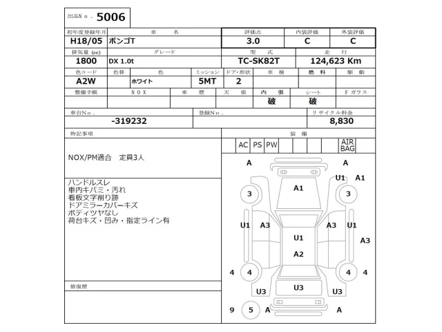 Аукцион NISSAN Osaka Дата аукциона 12.01.2026 Год2006 Тип кузоваБортовой грузовик Номер кузоваSK82T Объем1800 сс Трансмиссия 5MT Привод FR Пробег 124 000 км Цветбелый Оценка3