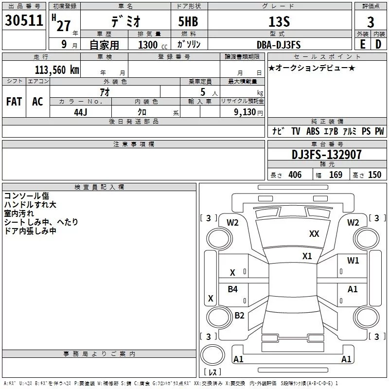 Аукцион TAA Chubu Дата аукциона 18.12.2025 Год2015 Тип кузоваХэтчбек Номер кузоваDJ3FS Объем1300 сс Трансмиссия FAT Привод Автомат Пробег 114 000 км Цветсиний Оценка3