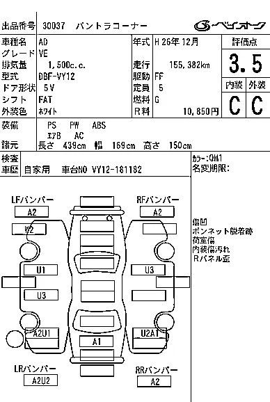 Аукцион BAYAUC Дата аукциона 14.01.2026 Год2014 Тип кузоваУниверсал Номер кузоваVY12 Объем1500 сс Трансмиссия FAT Пробег 156 000 км Цветбелый Оценка3.5