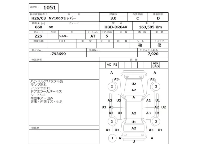 Аукцион NISSAN Osaka Дата аукциона 23.03.2026 Год2014 Номер кузоваDR64V Объем660 сс Трансмиссия Автомат Пробег 163 000 км Цветсеребро Оценка3