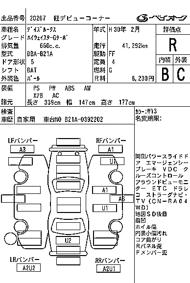 Аукцион BAYAUC Дата аукциона 22.10.2025 Год2018 Тип кузоваХэтчбек Номер кузоваB21A Объем660 сс Трансмиссия DAT Привод FF,FULLTIME4WD Пробег 42 000 км Цветбелый ОценкаR