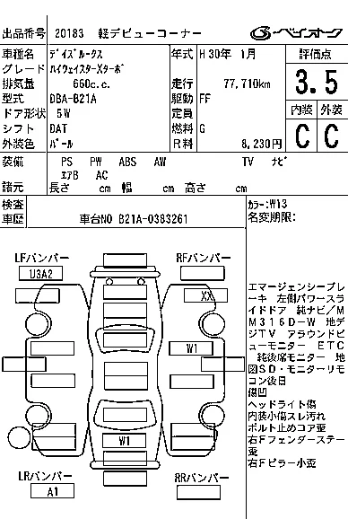 Аукцион BAYAUC Дата аукциона 14.01.2026 Год2018 Тип кузоваХэтчбек Номер кузоваB21A Объем660 сс Трансмиссия DAT Привод FF,FULLTIME4WD Пробег 78 000 км Цветбелый Оценка3.5