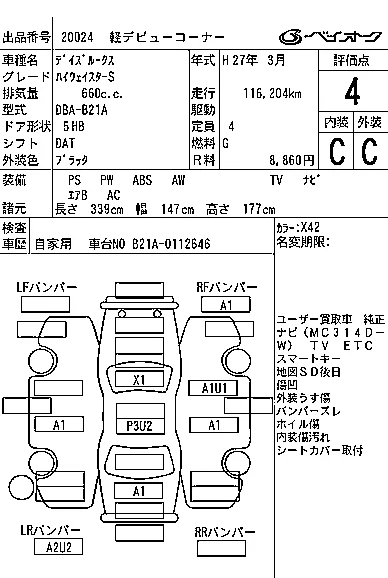 Аукцион BAYAUC Дата аукциона 25.02.2026 Год2015 Тип кузоваХэтчбек Номер кузоваB21A Объем660 сс Трансмиссия DAT Привод FF,FULLTIME4WD Пробег 117 000 км Цветчерный Оценка4