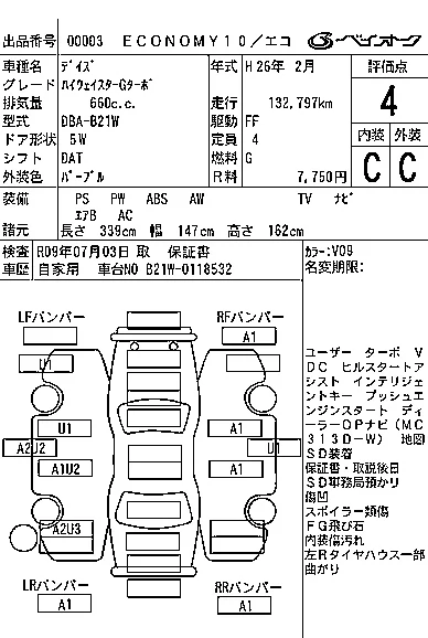 Аукцион BAYAUC Дата аукциона 19.11.2025 Год2014 Тип кузоваХэтчбек Номер кузоваB21W Объем660 сс Трансмиссия DAT Привод FF,FULLTIME4WD Пробег 133 000 км Цветфиолетовый Оценка4