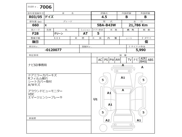 Аукцион NISSAN Osaka Дата аукциона 06.04.2026 Год2021 Тип кузоваХэтчбек Номер кузоваB43W Объем660 сс Трансмиссия Автомат Привод Автомат Пробег 21 000 км Цветзеленый Оценка4.5