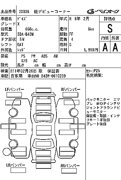 Аукцион BAYAUC Дата аукциона 08.04.2026 Год2026 Тип кузоваХэтчбек Номер кузоваB43W Объем660 сс Трансмиссия DAT Привод Автомат Цветкрасный ОценкаS