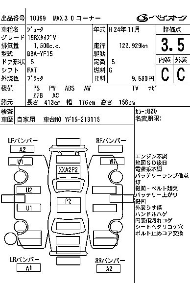 Аукцион BAYAUC Дата аукциона 10.12.2025 Год2012 Тип кузоваДжип/SUV Номер кузоваYF15 Объем1500 сс Трансмиссия FAT Привод Автомат Пробег 123 000 км Цветчерный Оценка3.5