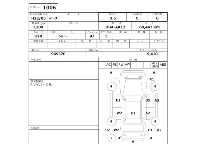 Аукцион NISSAN Osaka Дата аукциона 17.11.2025 Год2010 Тип кузоваХэтчбек Номер кузоваAK12 Объем1200 сс Трансмиссия Автомат Привод Автомат Пробег 60 000 км Цветсеребро Оценка3.5