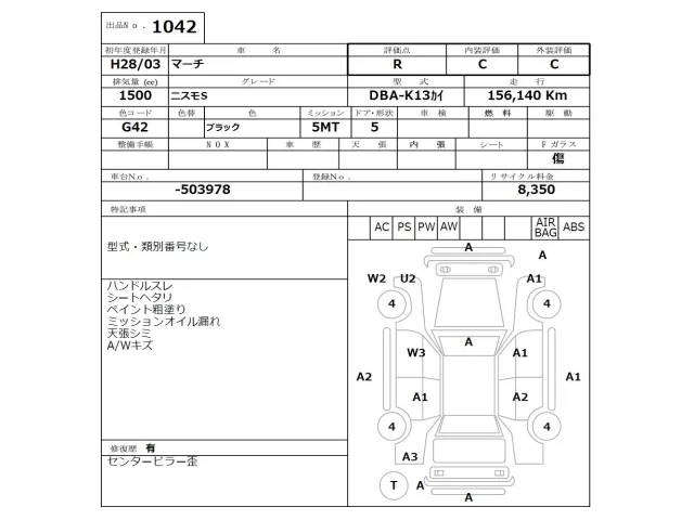 Аукцион NISSAN Osaka Дата аукциона 12.01.2026 Год2016 Номер кузоваK13カイ Объем1500 сс Трансмиссия 5MT Пробег 156 000 км Цветчерный ОценкаR