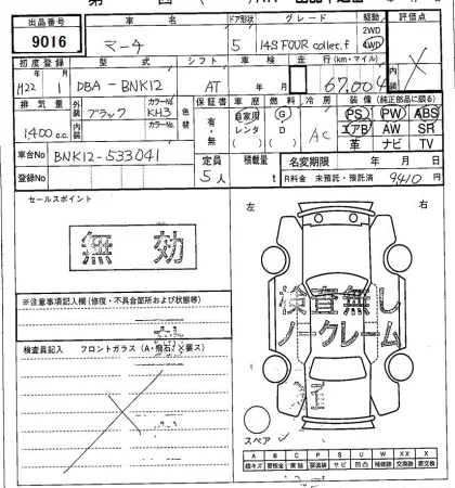 Аукцион SAA Sapporo Дата аукциона 24.02.2026 Год2010 Тип кузоваХэтчбек Номер кузоваBNK12 Объем1400 сс Трансмиссия Автомат Привод FULLTIME4WD Пробег 67 000 км Цветчерный