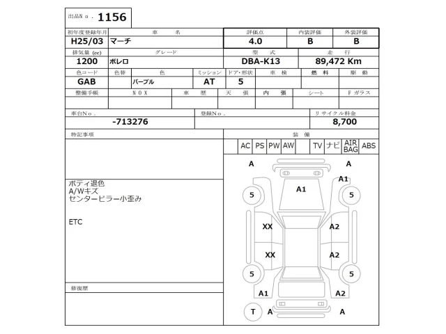 Аукцион NISSAN Osaka Дата аукциона 06.04.2026 Год2013 Тип кузоваХэтчбек Номер кузоваK13 Объем1200 сс Трансмиссия Автомат Привод Автомат Пробег 89 000 км Цветфиолетовый Оценка4