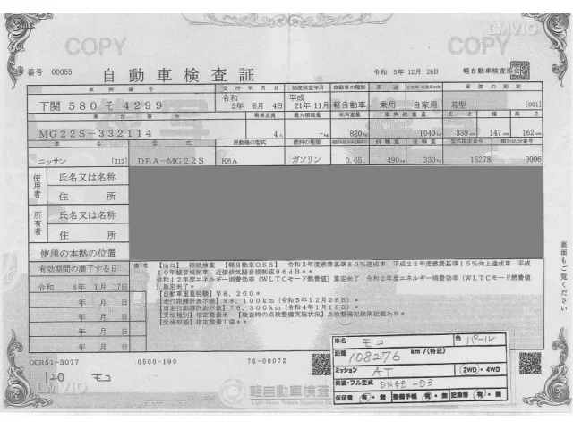 Аукцион ORIX Fukuoka Nyusatsu Дата аукциона 20.01.2026 Год2009 Тип кузоваХэтчбек Номер кузоваMG22S Объем660 сс Трансмиссия Автомат Привод FF,FULLTIME4WD Пробег 108 000 км Цветбелый Оценка4