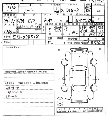 Аукцион SAA Sapporo Дата аукциона 18.11.2025 Год2012 Тип кузоваХэтчбек Номер кузоваE12 Объем1200 сс Трансмиссия Автомат Привод Автомат Пробег 88 000 км Цветфиолетовый Оценка4