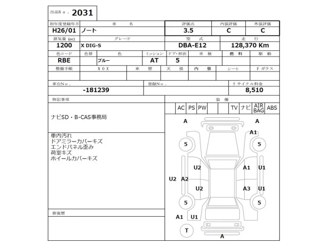Аукцион NISSAN Osaka Дата аукциона 23.02.2026 Год2014 Тип кузоваХэтчбек Номер кузоваE12 Объем1200 сс Трансмиссия Автомат Привод Автомат Пробег 128 000 км Цветсиний Оценка3.5