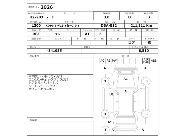 Аукцион NISSAN Osaka Дата аукциона 23.02.2026 Год2015 Тип кузоваХэтчбек Номер кузоваE12 Объем1200 сс Трансмиссия Автомат Привод Автомат Пробег 211 000 км Цветсиний Оценка3