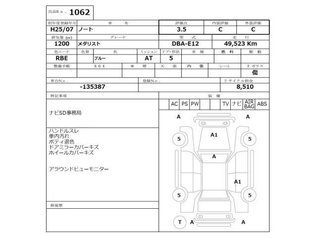 Аукцион NISSAN Osaka Дата аукциона 23.03.2026 Год2013 Тип кузоваХэтчбек Номер кузоваE12 Объем1200 сс Трансмиссия Автомат Привод Автомат Пробег 49 000 км Цветсиний Оценка3.5
