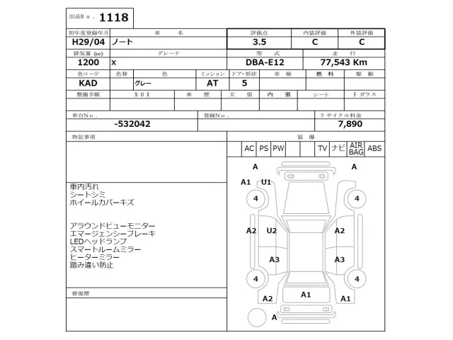 Аукцион NISSAN Osaka Дата аукциона 30.03.2026 Год2017 Тип кузоваХэтчбек Номер кузоваE12 Объем1200 сс Трансмиссия Автомат Привод Автомат Пробег 77 000 км Цветсерый Оценка3.5