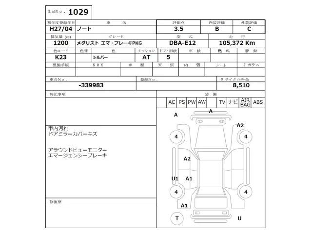 Аукцион NISSAN Osaka Дата аукциона 06.04.2026 Год2015 Тип кузоваХэтчбек Номер кузоваE12 Объем1200 сс Трансмиссия Автомат Привод Автомат Пробег 105 000 км Цветсеребро Оценка3.5