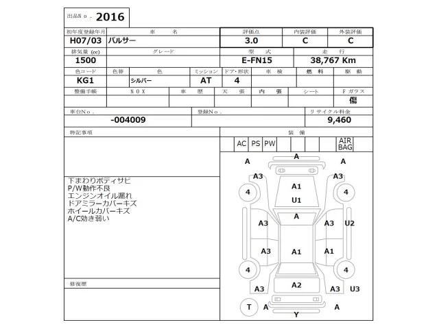 Аукцион NISSAN Osaka Дата аукциона 06.04.2026 Год1995 Тип кузоваСедан Номер кузоваFN15 Объем1500 сс Трансмиссия Автомат Привод Автомат Пробег 38 000 км Цветсеребро Оценка3