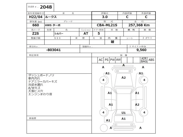 Аукцион NISSAN Osaka Дата аукциона 13.04.2026 Год2010 Тип кузоваХэтчбек Номер кузоваML21S Объем660 сс Трансмиссия Автомат Привод FF,FULLTIME4WD Пробег 257 000 км Цветсеребро Оценка3