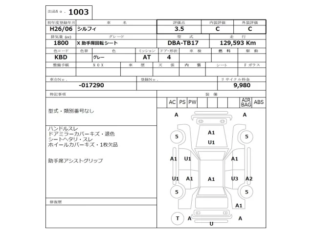 Аукцион NISSAN Osaka Дата аукциона 10.11.2025 Год2014 Тип кузоваСедан Номер кузоваTB17 Объем1800 сс Трансмиссия Автомат Привод Автомат Пробег 129 000 км Цветсерый Оценка3.5